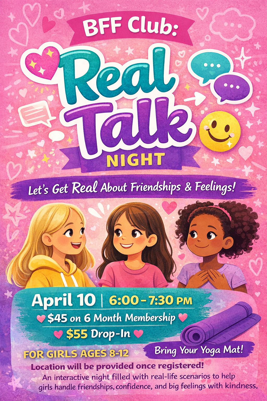 At Real Talk, we’ll be diving into real-life situations girls face every day — friendships, feeling left out, knowing what to say, and learning how to handle big emotions with confidence and kindness. Through fun, interactive activities and guided discussions, girls will build the skills they need to navigate their world while staying true to who they are.